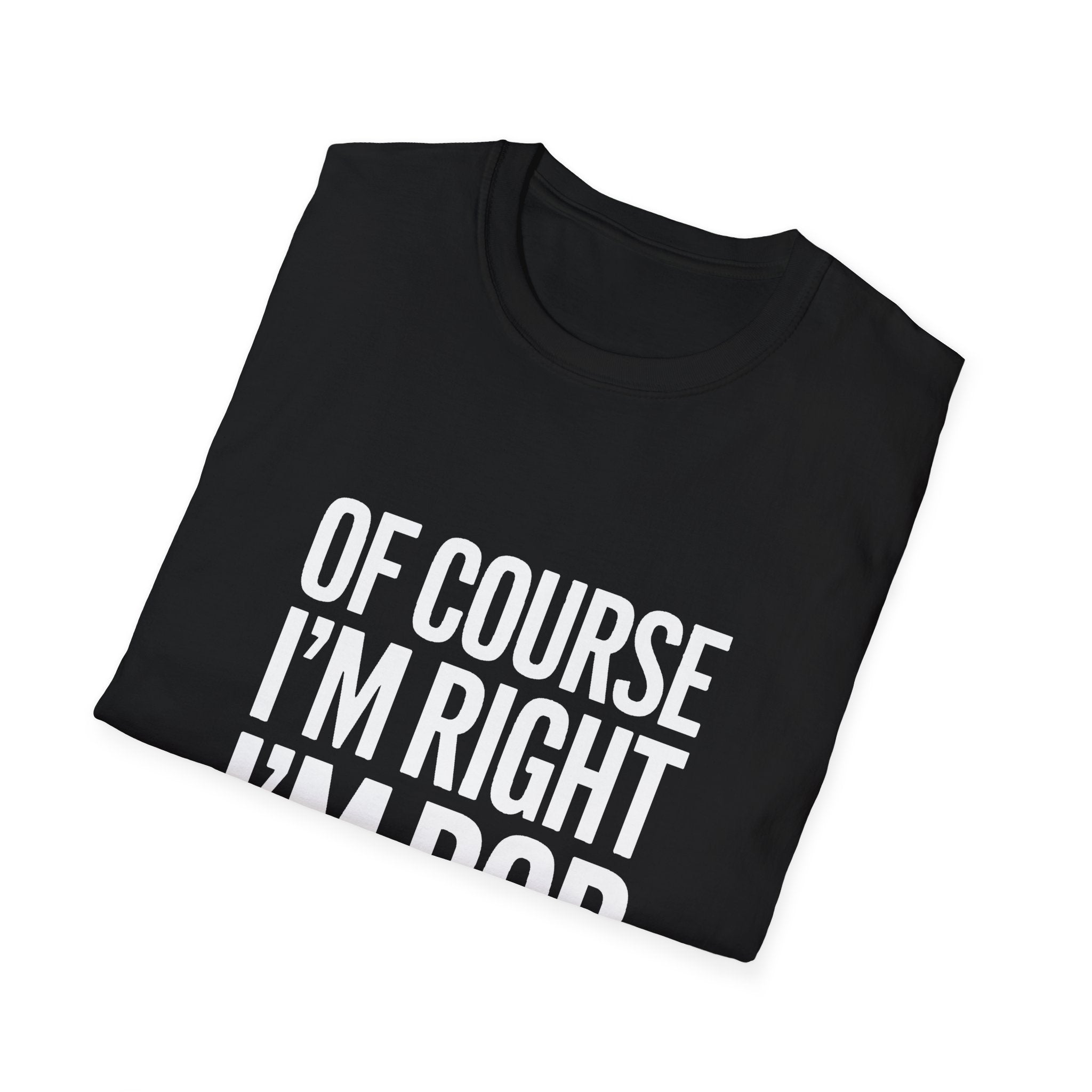 A unisex softstyle T-shirt that exudes confidence with its 'Of Course I'm Right I'm Bob' design. Perfect for those who enjoy a touch of humor and want to make a statement. Ideal for casual wear or as a fun gift for family and friends. Relevant for birthdays, holidays, and casual occasions.
